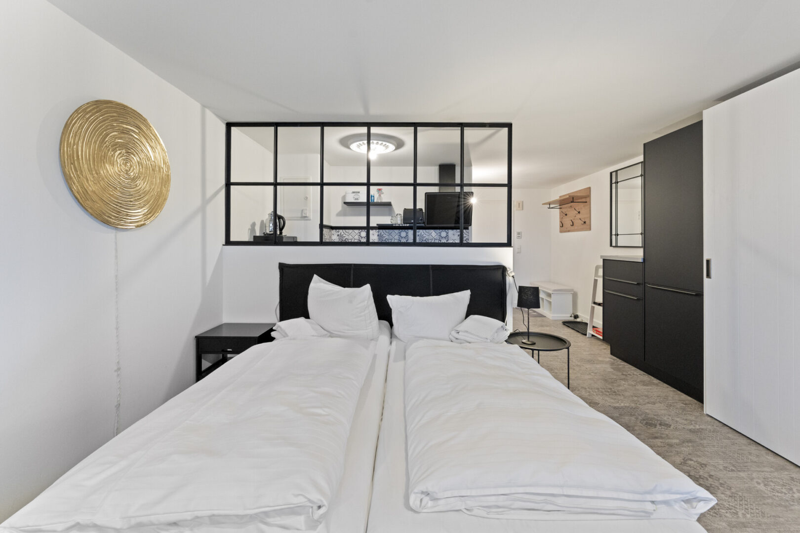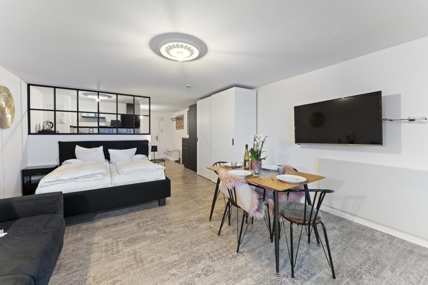 Die Wohnung verfügt über einen gemütlichen Wohn-/Essbereich, einer abgetrennten, hochwertigen Küche und ein modernes Badezimmer, ideal für Singles oder Paare, die eine erholsame Rückzugsmöglichkeit suchen. Der hochwertige Korkfußboden bringt eine warme, einladende Atmosphäre in die Räumlichkeiten.